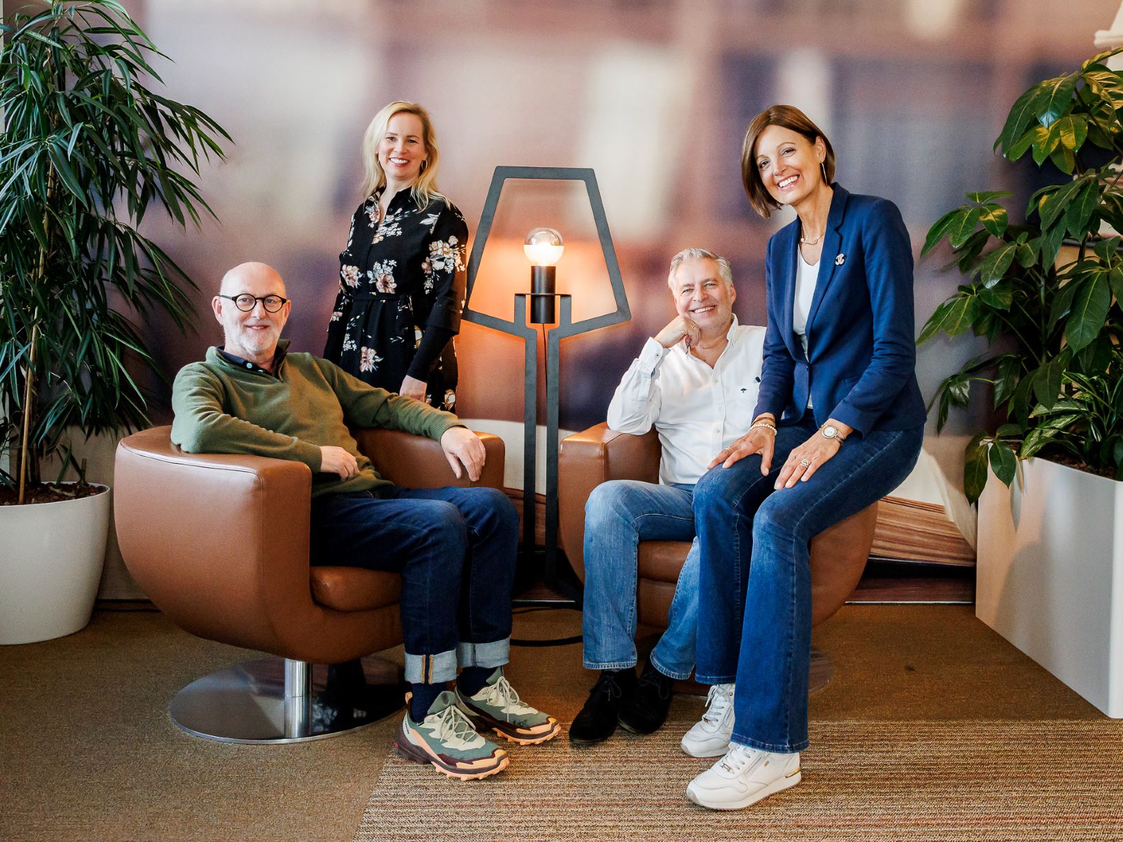 Het bestuur bestaat uit drie vrijwilligers: (van links naar rechts) voorzitter Maarten van Rooij, penningmeester Babett Häntze, secretaris Joost van Heck plus organisator Paulien Kegge.